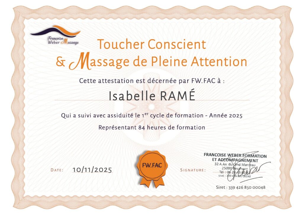 Toujours curieuse et dans une quête constante de sens et de justesse dans la relation d’aide, je me suis formée en TC/MPA : Toucher conscient – Massage de Pleine Attention auprès de Françoise Weber, enseignante reconnue depuis plus de 30 ans dans le domaine de la santé.